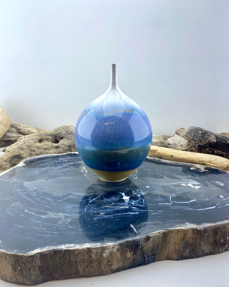Crafted on the potter's wheel, spray-glazed with multiple glaze layers, and fired at 1222°C